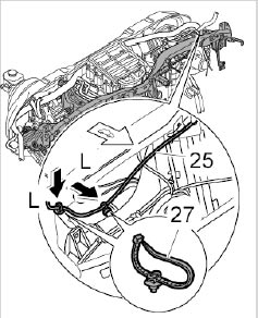 9.1. Clip in antenna lines for PCM -25- at the fixing clips -26- and -27- -Arrows L-.