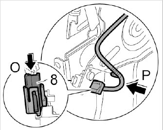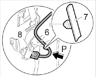 12.2. Clip in wire harness -6- on fastening clip -7- -arrow P-.