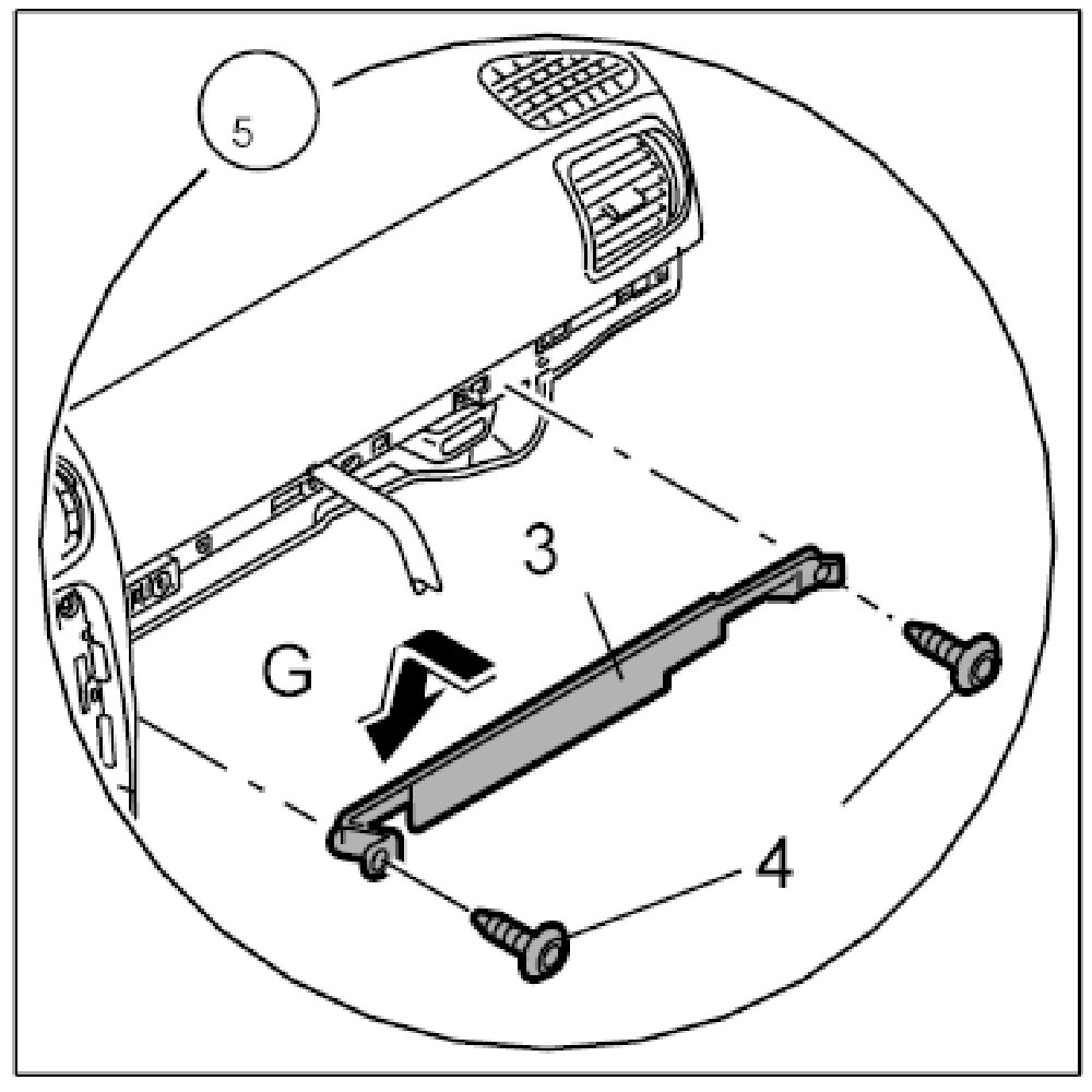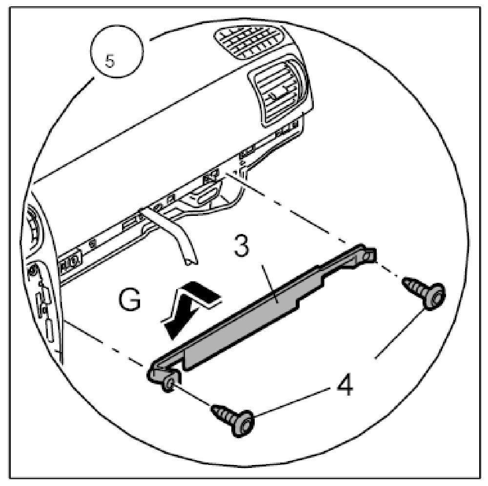 12. Only on USA version: Insert the sheetmetal reinforcement on the passenger's side -3- -arrow G-.