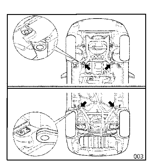 1.3 Position the vehicle on the platform lift and lift using the lifting points (Figure 003, arrows) - see Technical Manual.