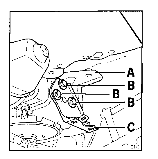 5.3.1 Position the right front holder (A) with the holder of the compressor bracket (C) and screw in the hexagon-head flat screws (B).