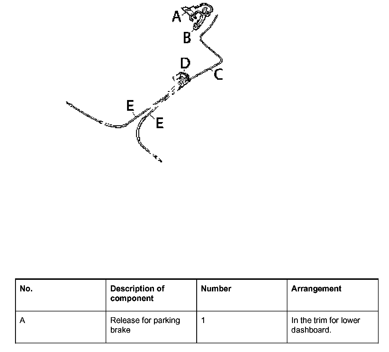 A cable is routed from the foot-operated lever to a deflection lever under the centre console, which transmits traction to a turnbuckle with a transmission ration of 3.1. Two cables are routed from the turnbuckle to the parking brake on the rear axle.