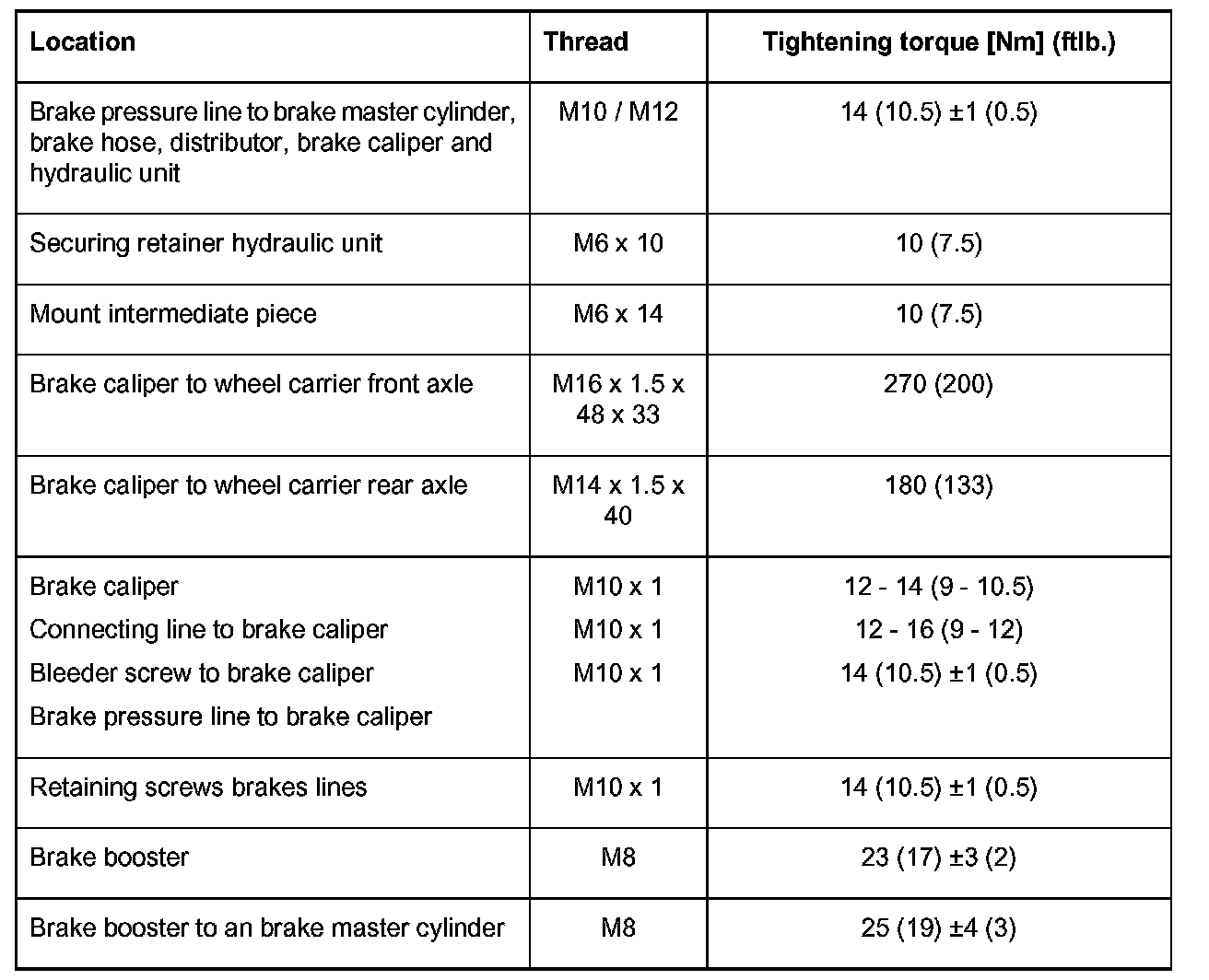 Tightening Torques For Brake Hydraulics