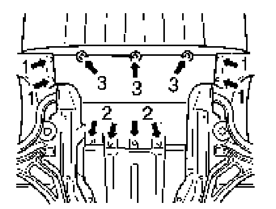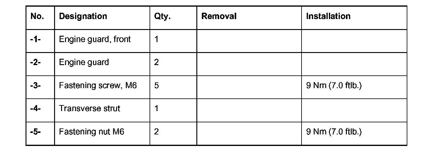 1. Remove the front engine guard. To do this, loosen the screws -1- at the front and side. Then loosen the rear -2- and front screws -3- .