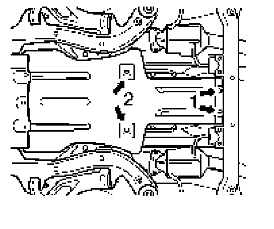 2. Remove rear engine guard. To do this, loosen the fastening screws on the transmission cross member -1- and the screws on the traverse strut -2- .