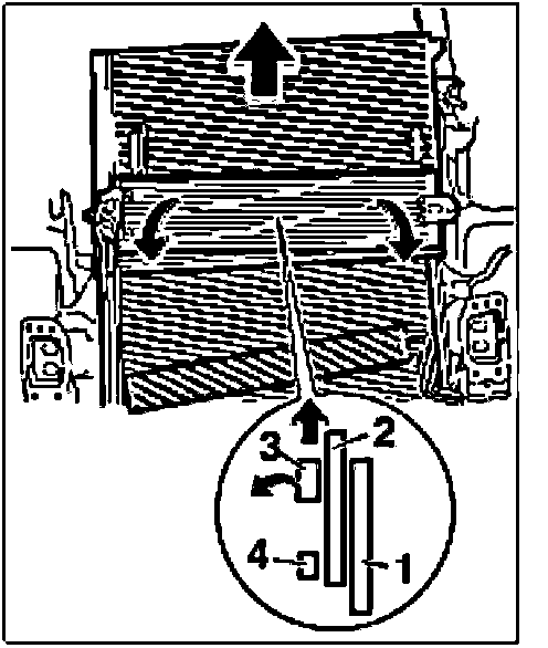 7. Carefully remove the condenser upwards -2- making sure that the other radiators are not damaged by the edges and corners of the condenser.