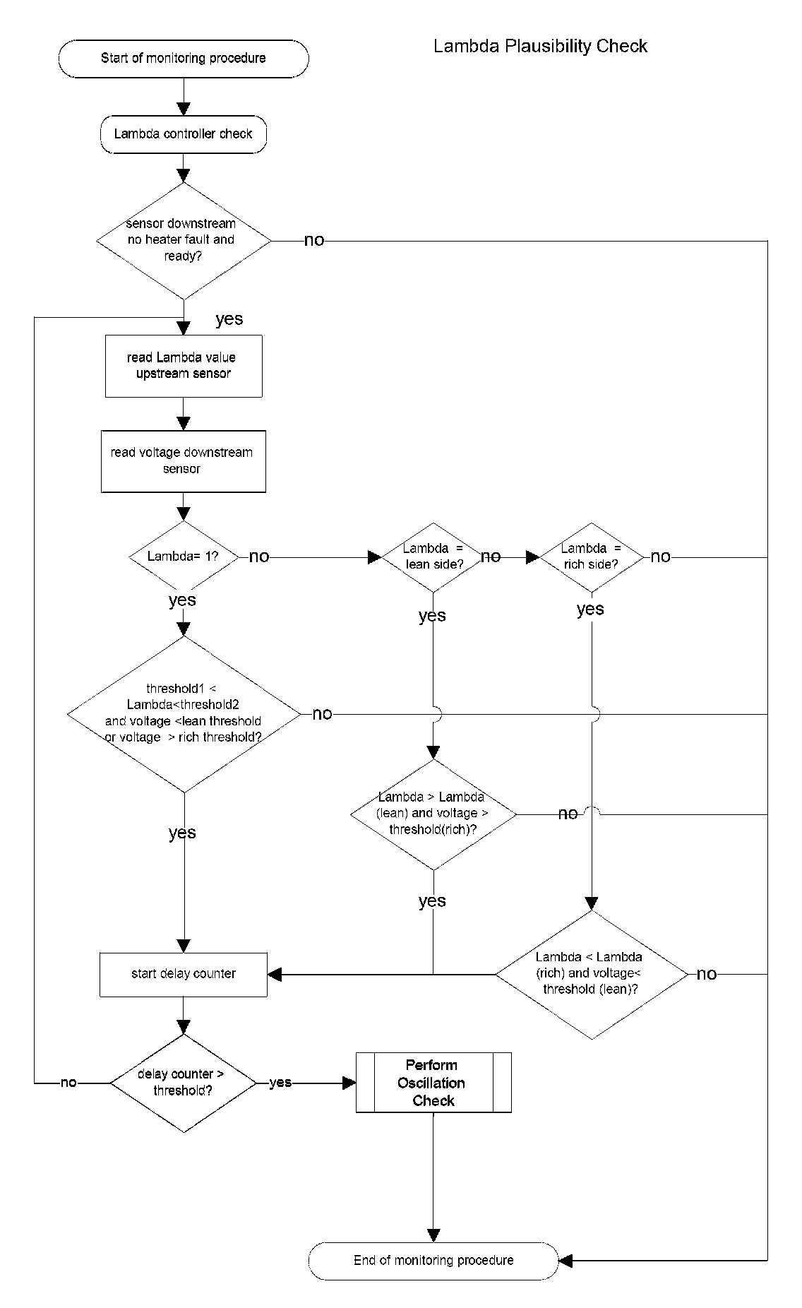 The Lambda value of oxygen sensor upstream catalyst is compared to the sensor voltage downstream catalyst. Additionally, a hardware check is performed by checking the sensor voltage range. Three diagnostics paths covers the air fuel ratio range of Lambda value (e.g. Lambda=1, lean, rich). A corresponding reaction of sensor voltage downstream catalyst is expected.