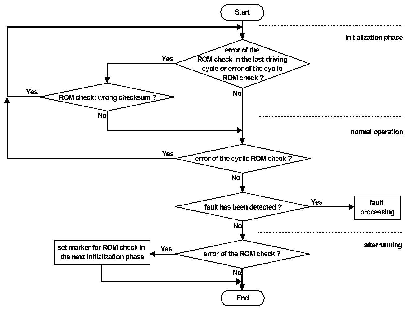 The ROM check is performed once per driving cycle after engine shutdown. In the case of a detected fault (a wrong checksum) the ROM check is repeated in the initialization phase of the following driving cycle. A detected fault in the initialization phase causes a RESET with no function running. Only a no-fault detection in the initialization phase will lead to a normal function and storing of the ROM - fault.