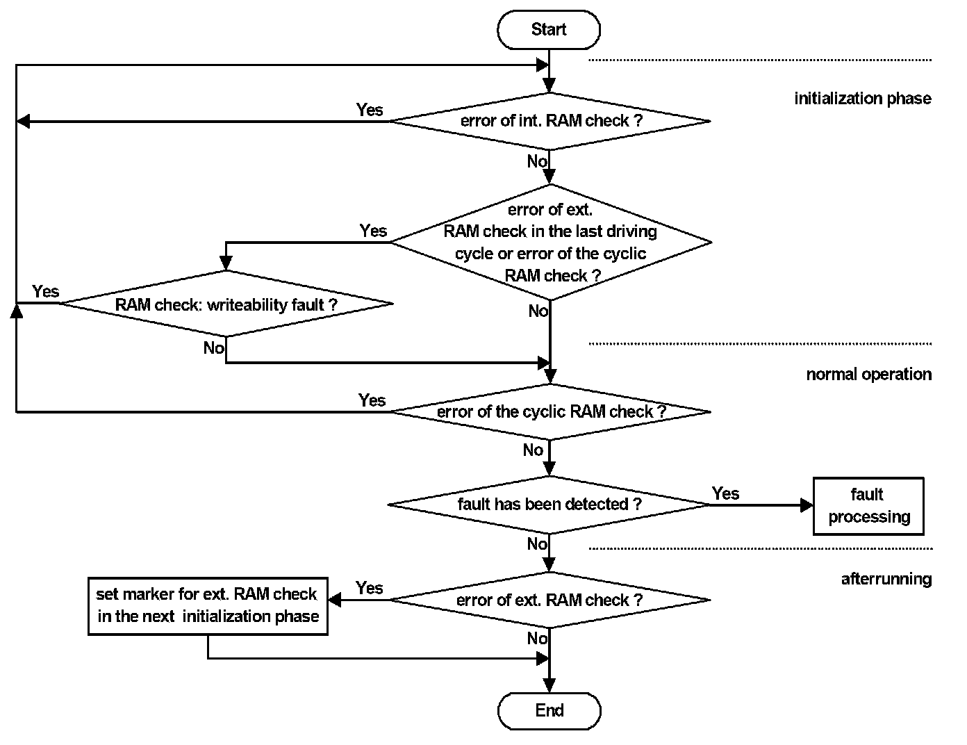 The RAM check is performed once per driving cycle, one part in the initialization phase and the other part in the after running. In case of a detected fault in the after running, this part of the RAM check is repeated in the initialization phase of the following driving cycle. A detected fault in the initialization phase causes a RESET with no function running. Only a no-fault detection in the initialization phase will lead to a normal function and storing the ROM - fault.