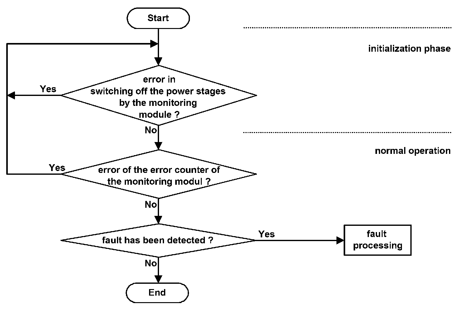 The switching off of the power stages by the monitoring module is checked once per driving cycle in the initialization phase. If the switching off of the power stages by the monitoring module is impossible a RESET is performed with no function running. Only no-fault detection will lead to a normal function and storing the RST - fault.