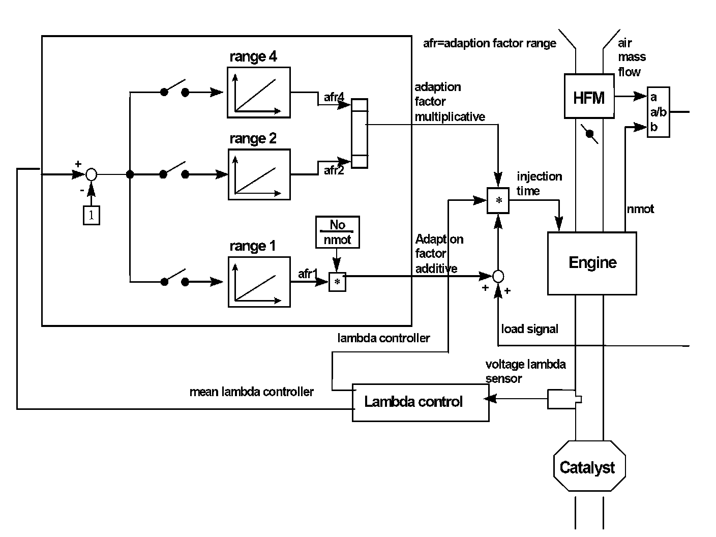 In the ECU the injection time is calculated from: 1) an HFM based basic load signal, 2) an additive correction of the mixture adaption, 3) a multiplicative correction from the lambda controller, and 4) a multiplicative correction of the mixture adaption. All correction factors are calculated at any time during engine operation.