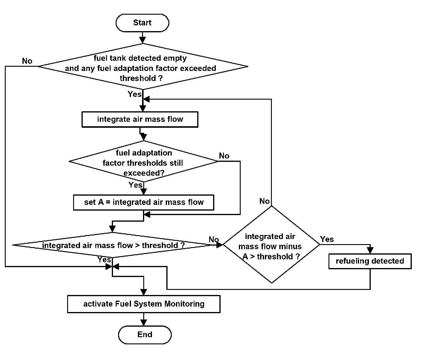 If the adaption factor goes under the diagnostic threshold before the integrated air mass goes over its threshold, there is no MIL activation. At the same time the integrated air mass is stored. This is done for a later refuelling detection.