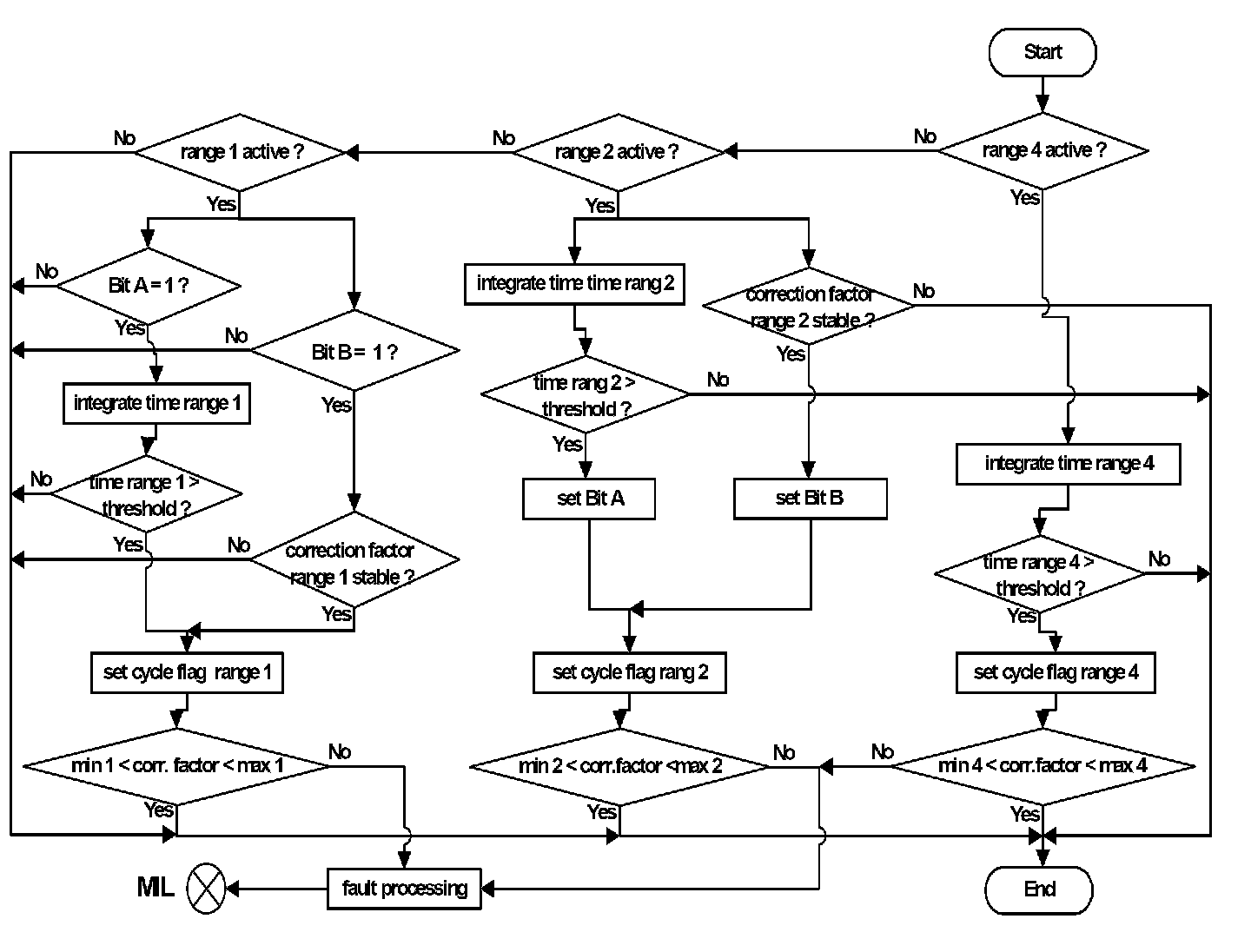 If range 1 is activated and the cycle flag of range 2 has been previously set, the adaption factor is checked for stability. If the adaption factor is stable the cycle flag is set. If the cycle flag from range 2 is not set but the flag for minimum time is set, the cycle flag can also be set, if the adaption range 1 has been activated for a certain period. It is now dependent on the values of the Adaption-Integrator, whether or not the MIL is illuminated.