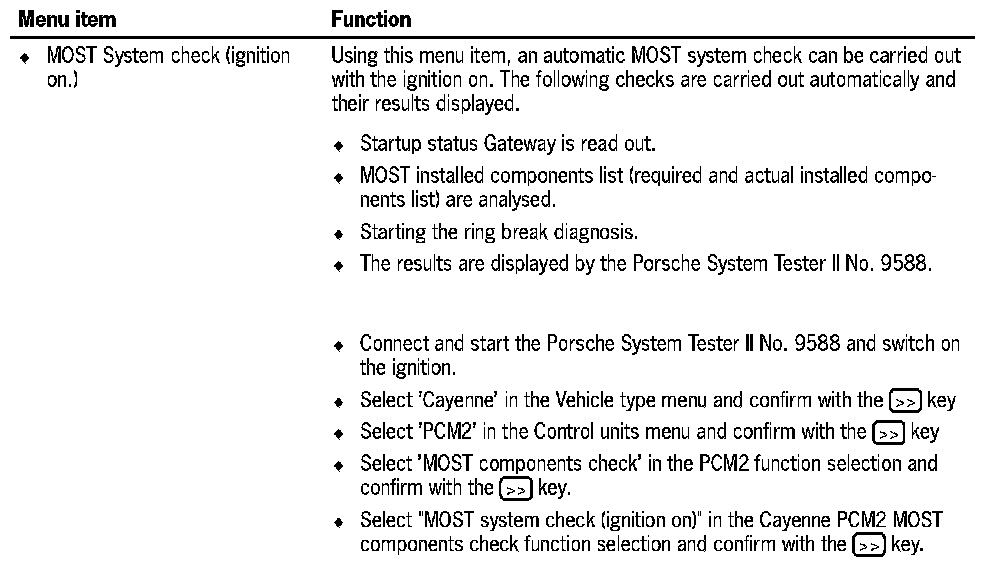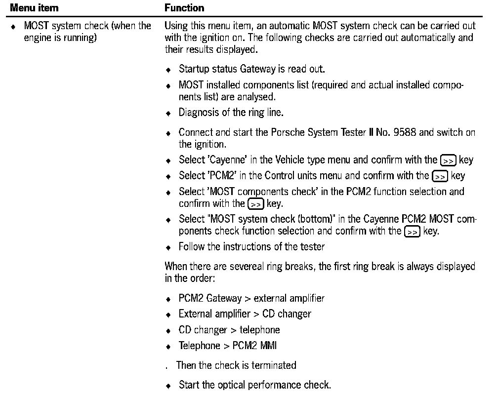 The MOST component check can be reached via the menu PCM2 function selection. This comprises a summary of the following check processes: