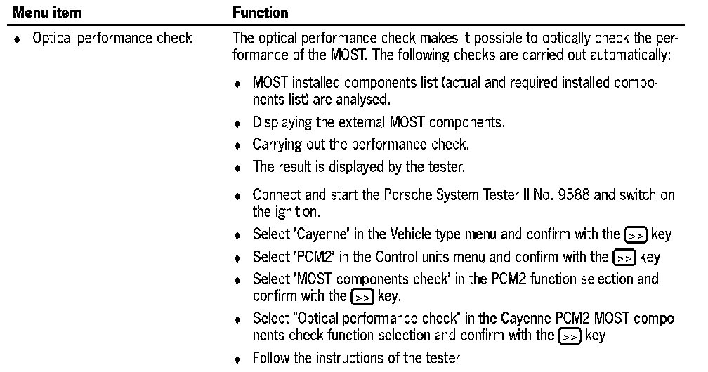 NOTE: When there is a customer complaint or identifiable problems but no fault code entries, firstly the 'MOST component check' is to be selected in the PCM2 function selection menu and then the 'MOST system check' is to be carried out.