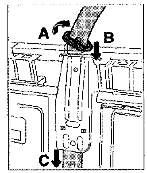 7. Remove three-point belt -arrow C- downwards.
