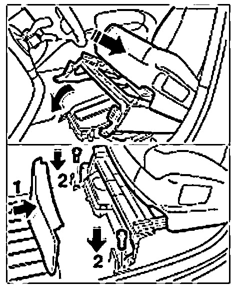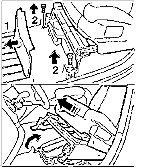 3. Fold the carpet sections forward and remove the two fastening screws -2-.