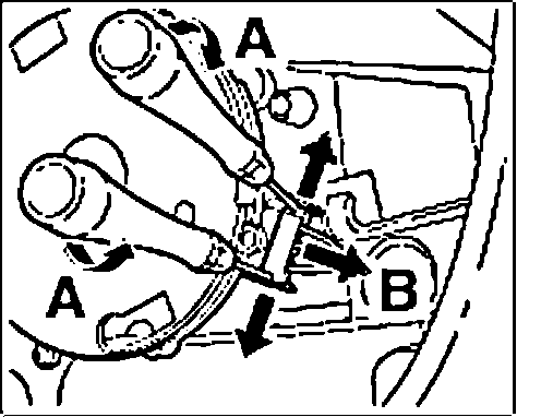 4. Unlock connector on mirror adjusting motor with 2 screwdrivers "arrow A" and remove "arrow B".