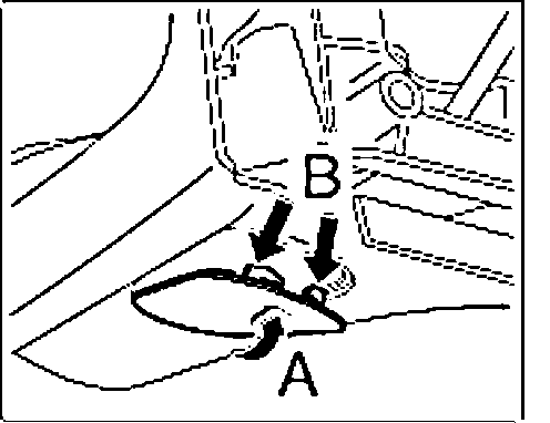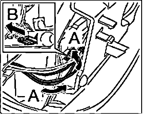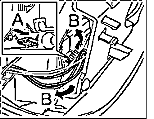 9. Link up connector to the mirror adjusting motor "arrow A" until the connector lock "B" engages firmly.