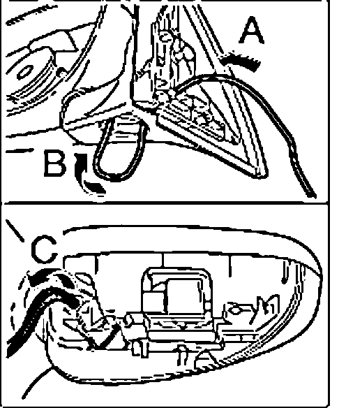 12. First pull the wiring downwards "arrow B" and take it out on the mirror base "arrow C".