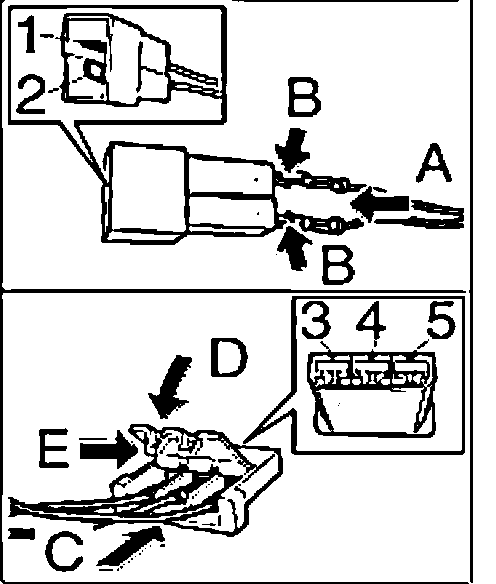 6. Insert the wires of the positioning motor into the combination connector "arrow C" until the plug contacts "3, 4& 5" click into place audibly.