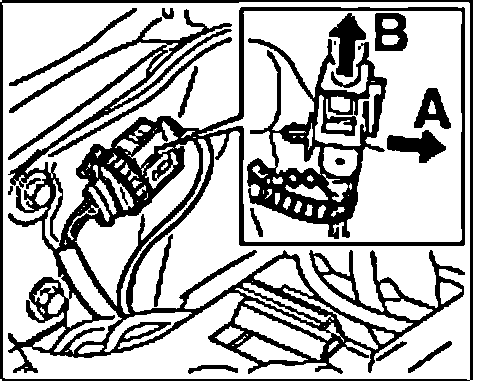 17. Connect the plug to the engine compartment light "arrow A" until the lock is felt to engage "arrows B".
