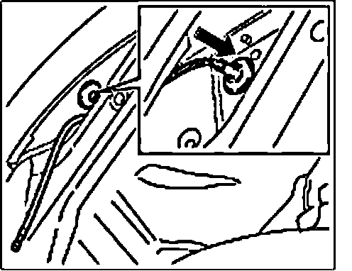 10. Push through the water line, together with the electrical lead, to the windscreen washer nozzles and pull out at the openings "arrow B".