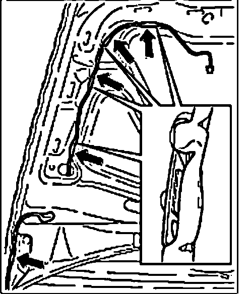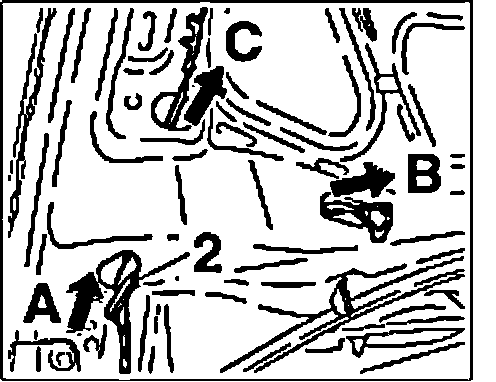 11. Pull the wiring harness to the engine compartment light out of the bonnet reinforcement "arrow C".