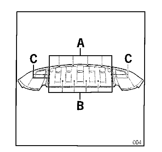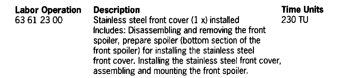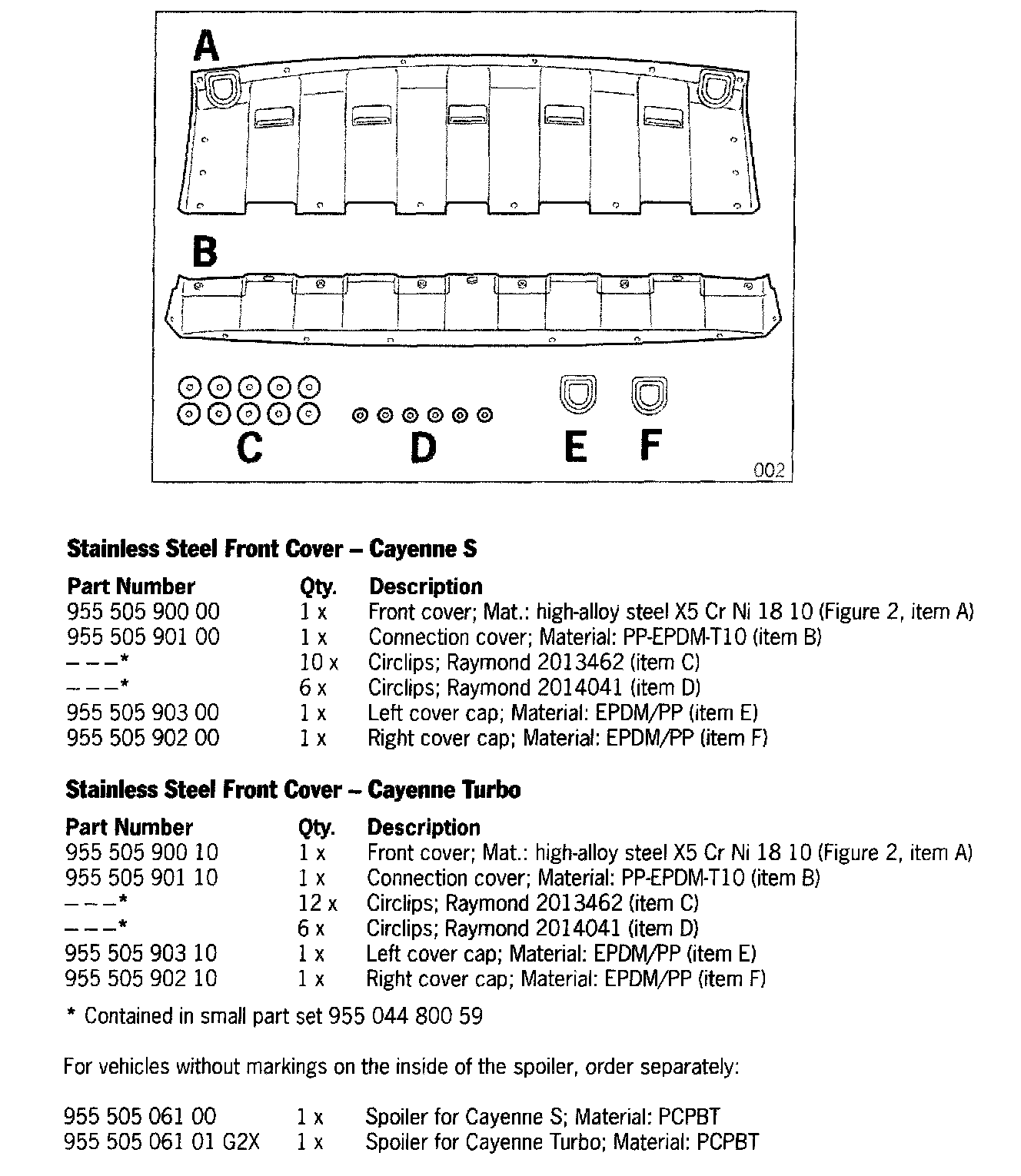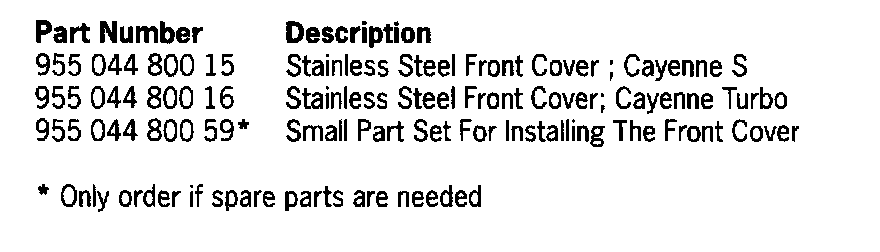 For the vehicles delivered as model year 03 (3), there is the possibility that there are no markings on the inside of the front cover bottom section (referred to as spoiler throughout these instructions). If this is the case, a new spoiler must be ordered. In addition, the new spoiler for the Cayenne Turbo is delivered primed and must be painted.