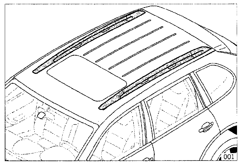 One roof rail (material: aluminium; paint: satin aluminium) can be installed in each of the two guide rails on the vehicle roof. The roof rail is elegantly integrated into the vehicle design, and can carry a maximum load of 165 lbs (75 kg). Bulky items can be transported using additional cross members.