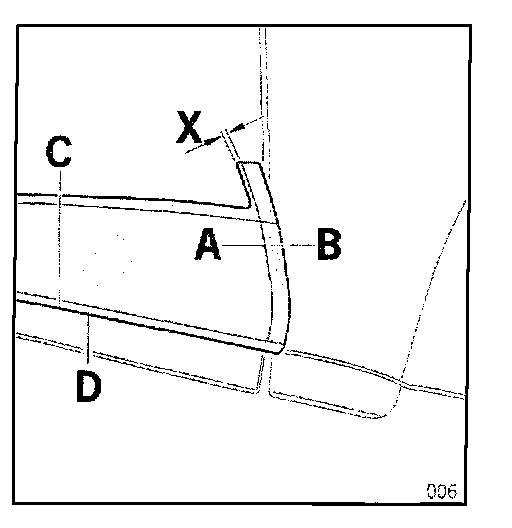 The template is correctly applied if the check dimension "X", measured between the door edge (B) and end of the template, is 4 mm +/- 1 mm.
