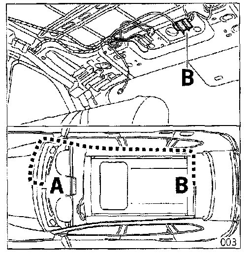 2.1 Route interior lead for antenna from holder for plug connection (referred to as "holder below) (B) in rear roof area along the upper roof rail to the PCM2 (A) installation slot and secure with tie wraps.