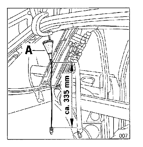 Distance X (roof rail rubber grommet to plug) = 335 mm. Observe direction of installation.