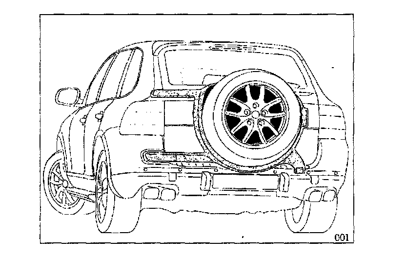 A spare wheel carrier (Figure 001) can be retrofitted to the above vehicles. This pivoting spare wheel carrier will hold any of the wheels offered in the Cayenne line-up, except for the size 10J x 20" SportTechno wheel.