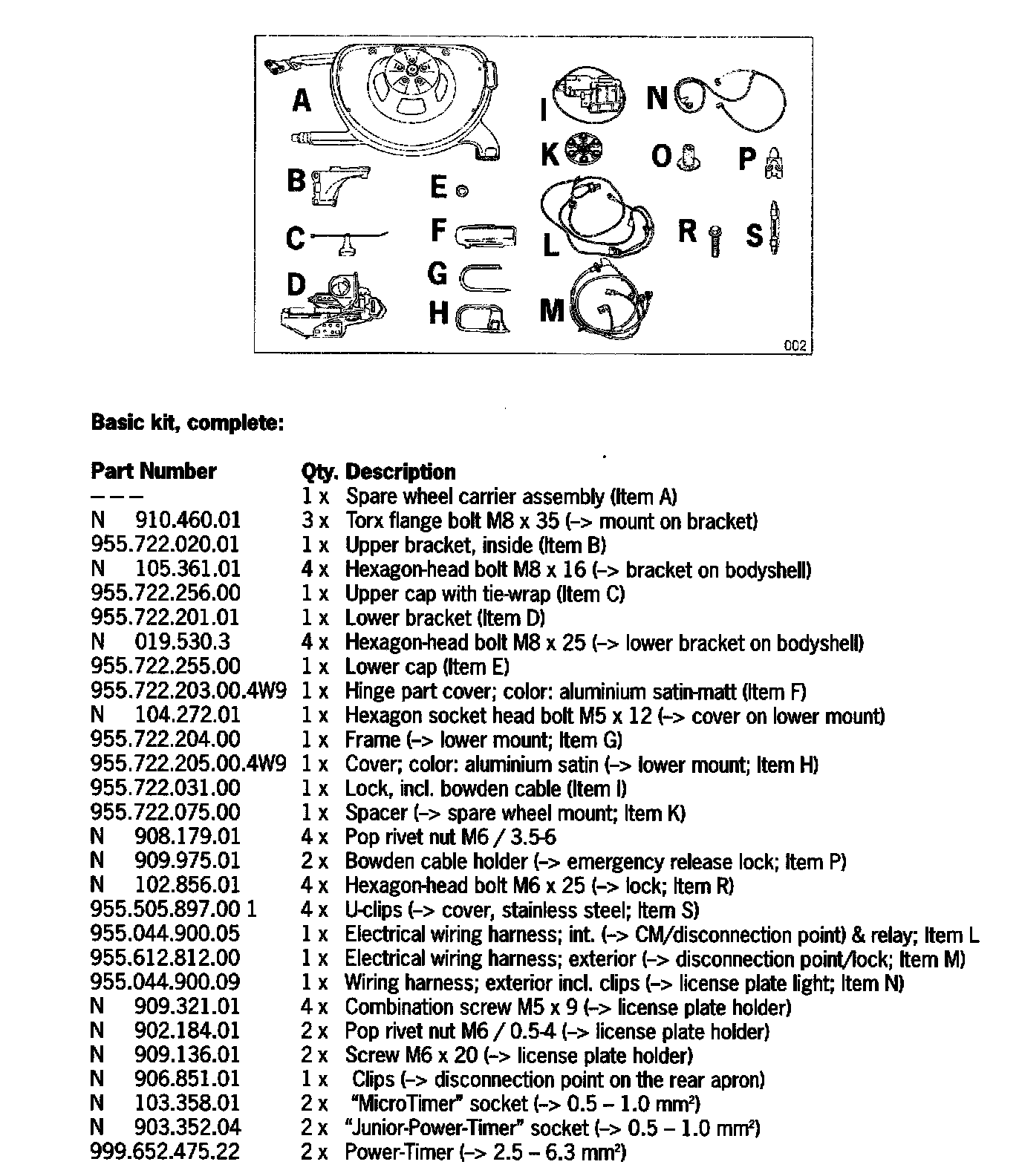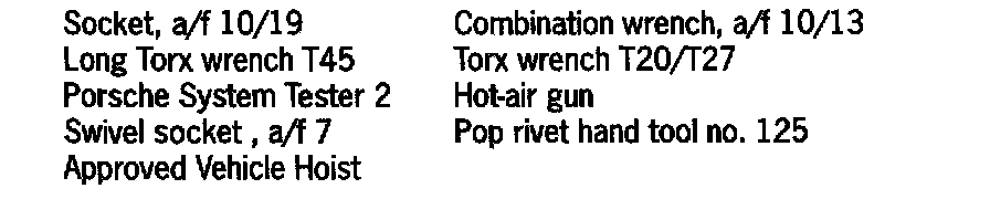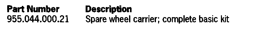 Additional parts such as the spare wheel and tire that will be held on the carrier, the corresponding wheel bolts and the spare wheel securing bolt have to be ordered separately according to PET (Porsche Electronic Parts catalog).