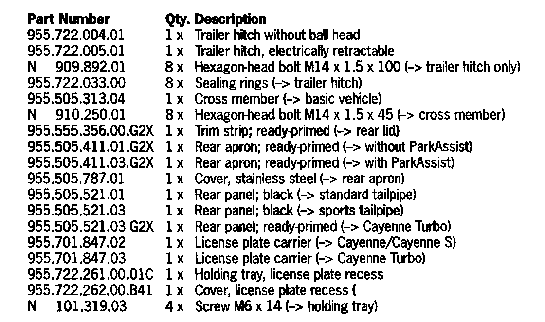 1.1 Paint new rear apron, cover for the rear lid and, in the case of the Cayenne Turbo, the bottom part of the rear apron in accordance with the vehicle color code as per the Paint Manual.