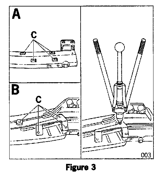 2.1.1 Check whether the 4 x pop rivet nuts M6 (spare wheel carrier lock assembly) are present on the new cross member (Figure 003, A) or on the new trailer hitch (inset B) at Item C.