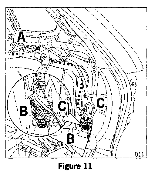 - checking degree of movement of the upper support (Item A) in the mount (Item B). The latter must not drag in area C when opening or closing the spare wheel carrier!
