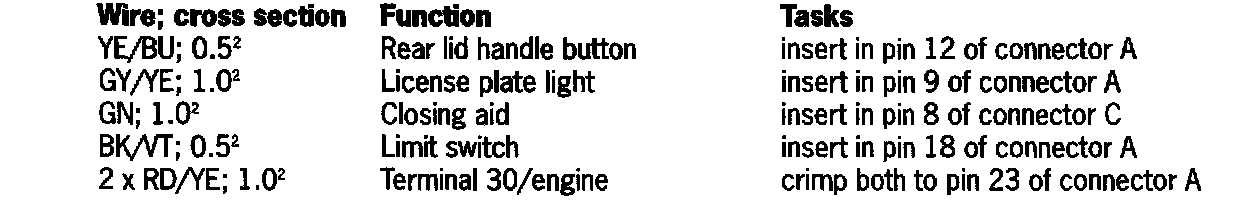 4.1.6 Decrimp old wires of license plate light from connector A (black, 23-pole); pin 9 of the "rear comfort systems" control module (CM) and tie back, as this connector is now obsolete.