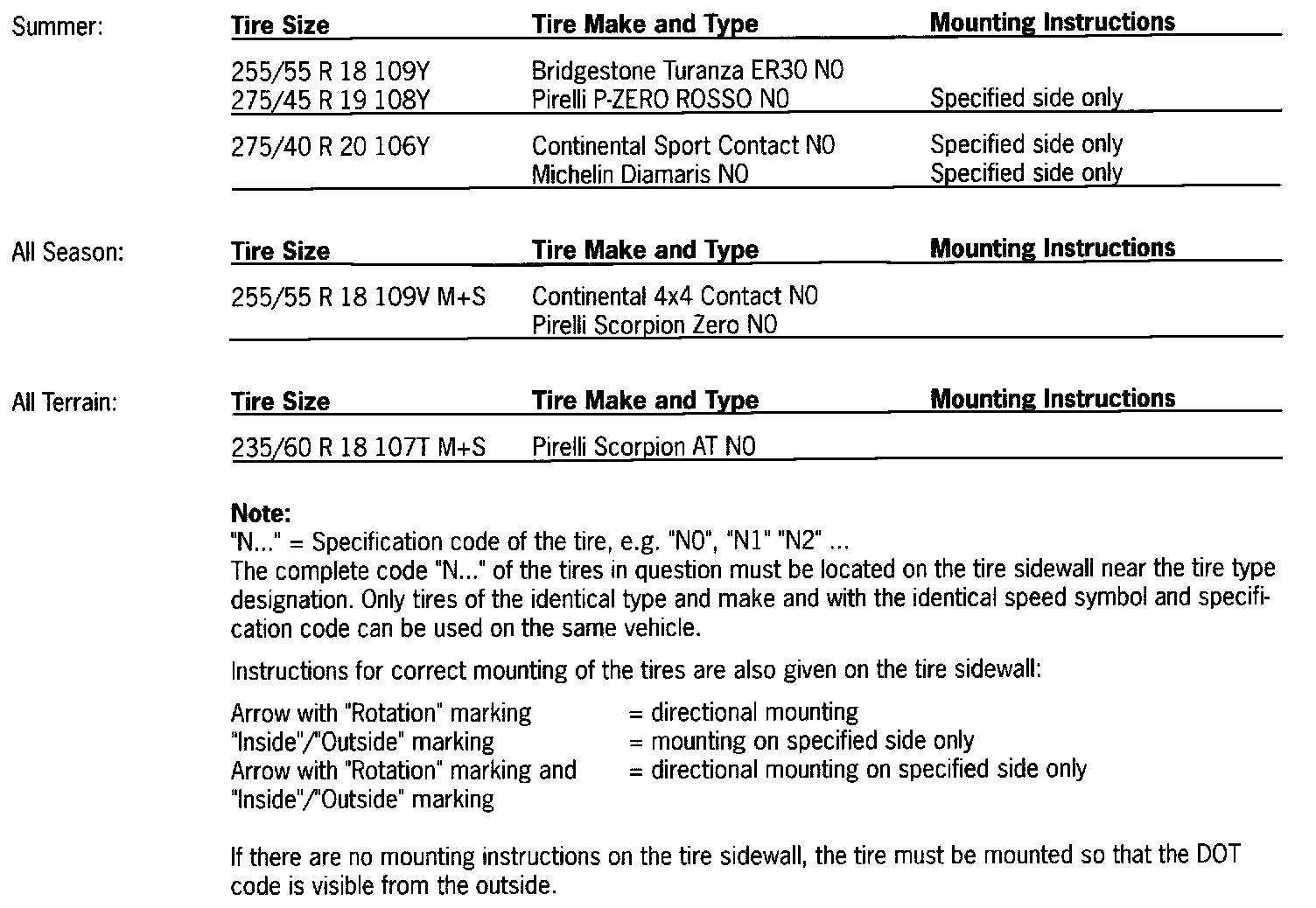 The specified tire pressures apply only to the tire types and makes approved by Porsche (including all of the winter, all-terrain, all-season and summer tire types) and are specified for cold tires approx. 68° F. (20° C.). These are minimum tire pressures and must always be observed, since in addition to the unfavorable driving performance, serious tire damage could be caused.
