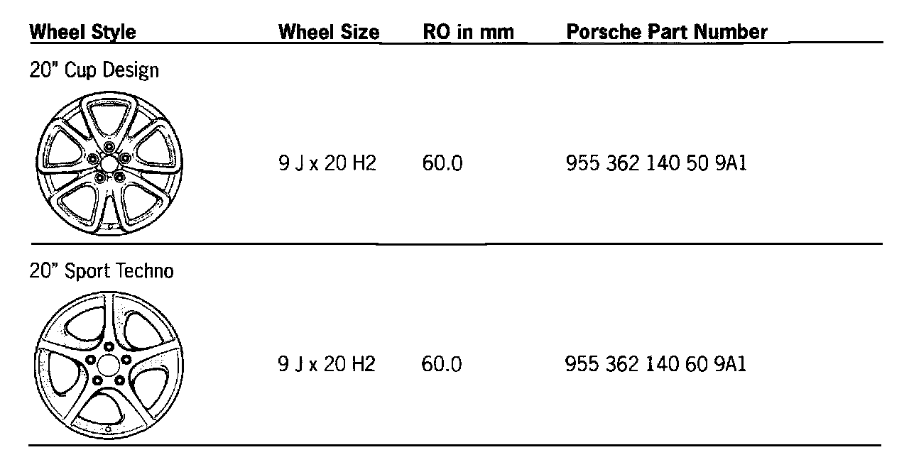 The wheels are secured with standard wheel bolts M 14 x 1.5 x 51, Part Number, 955 361 203 00. Tightening torque: 160 Nm (118 ftlb.).