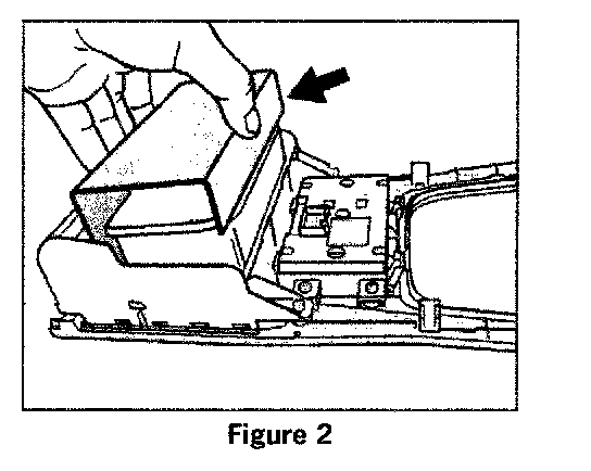 3.1.5 Stick the shield to the underside of the cupholder as shown in Figure 2 (arrow points to short leg of shield).