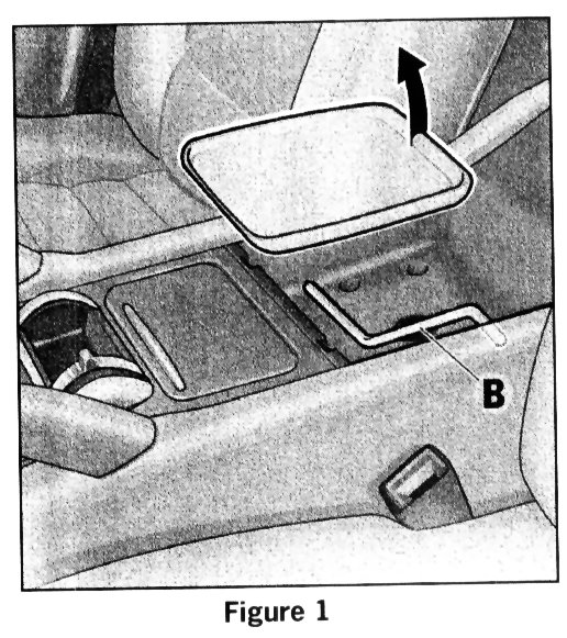 2. Take the Allen key (Figure 1, Item B) out of the lower storage compartment (under the rubber mat, Figure 1, arrow) of the center console and dispose of it.