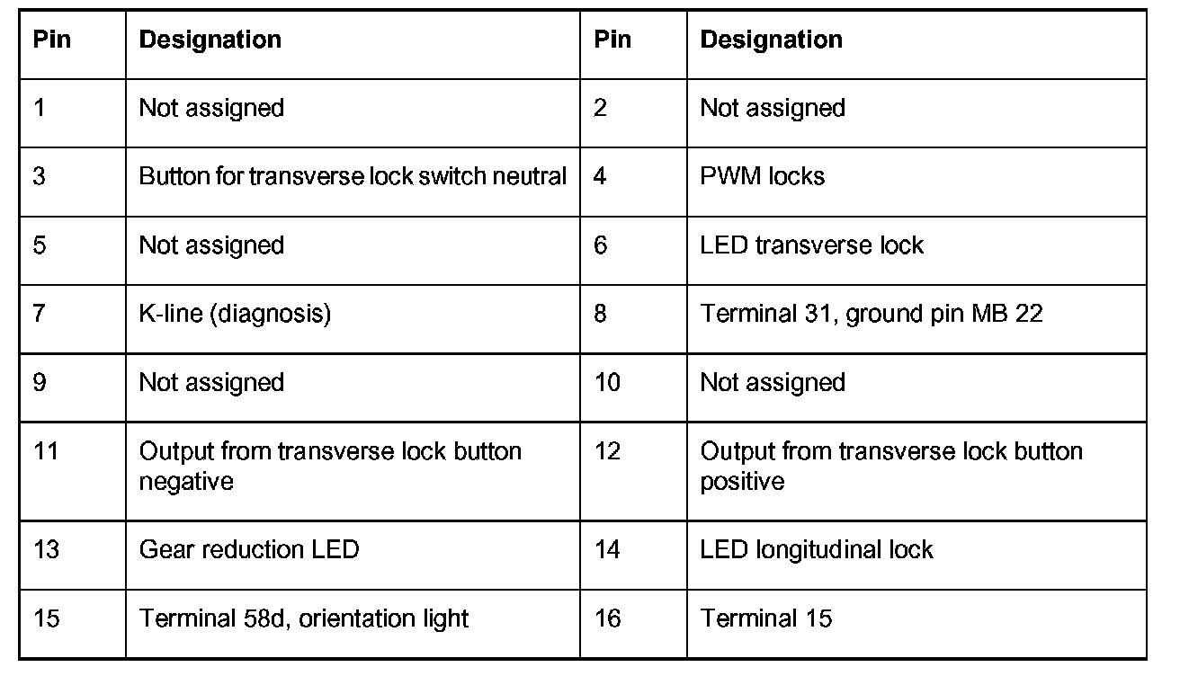 Gear selection switch connector assignment (running gear control module), 16-pin