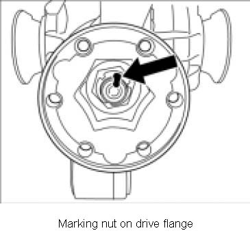 1. Mark position of nut on drive flange -arrow- at shaft.