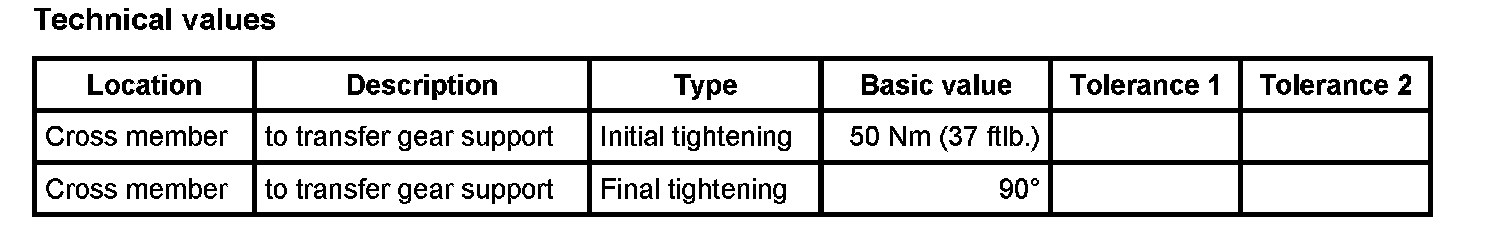7. Raise transmission a few centimeters and install transmission cross member on support. -A- -> Initial tightening: 50 Nm (37 ftlb.) -> Final tightening: 90°
