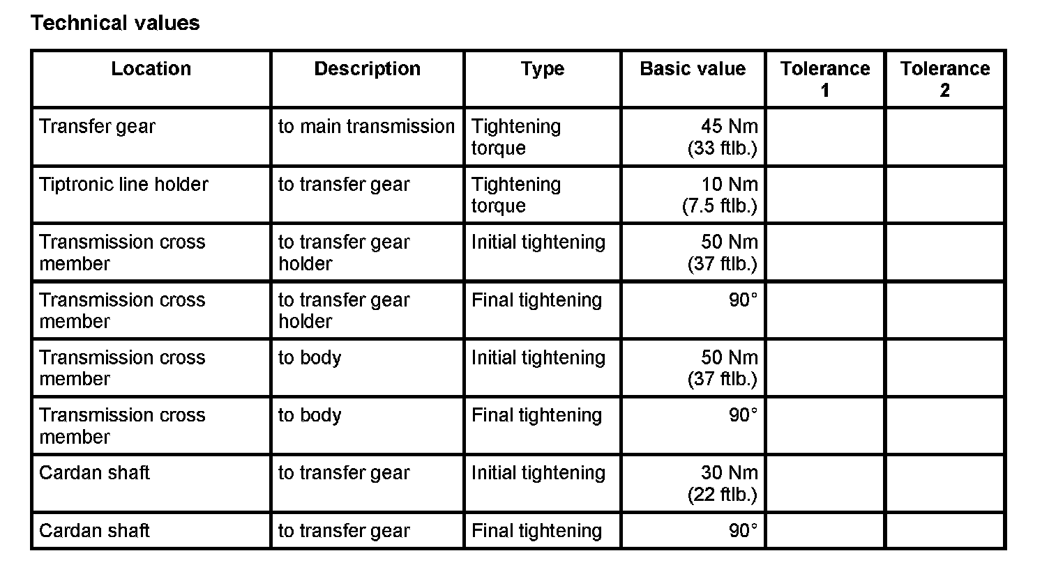 9. Connect front cardan shaft to transfer gear. -> Initial tightening: 30 Nm (22 ftlb.) -> Final tightening: 90°
