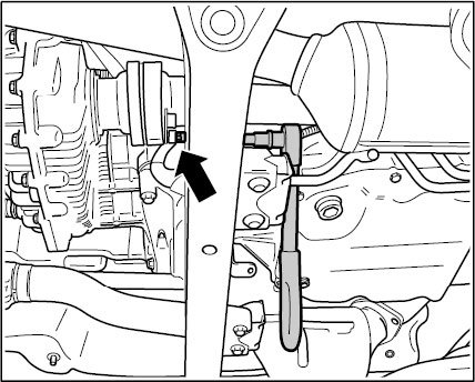 7. Place a wooden block -arrow- between the converter bell housing and suspension subframe.