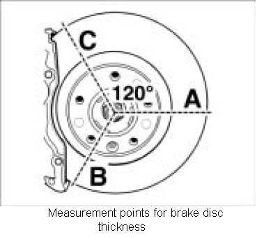 - Measure the brake discs with a suitable micrometer at a minimum of three different places (-A, B, C-), offset by 120°.