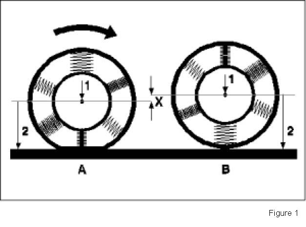 The radial force is a force that compresses a tire. Based on its size, a tire has softer (-item A-) and more rigid areas (-item B-) due to design and production-related factors. Given this, the tire compresses to various extents at a constant wheel load (-arrow 1-) and a constant tire pressure (-arrows 2-). This varying spring action (-X-) in the tire can cause vibrations in the chassis on even road surfaces and the driver may notice this as shaking in the steering wheel, for example. Measuring the radial force variation involves running the tire on a wheel balancer that measures radial force variation while applying a constant load to the tire. This simulates the rolling of the tire on a driving surface. Variations in radial force occur independently of the direction of rotation of the tire and are measured as the difference between the maximum and minimum radial force ("peak to peak" value).